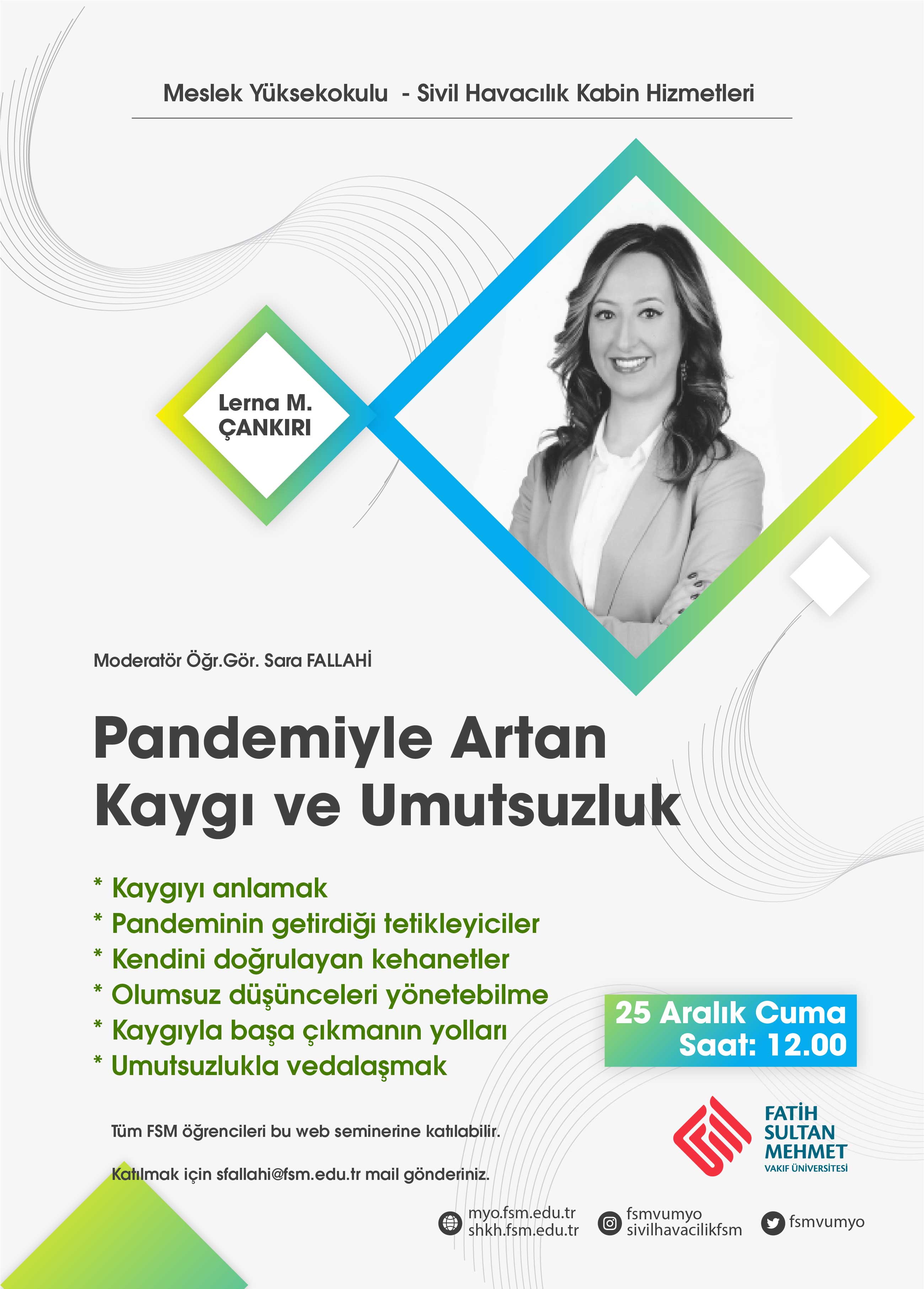 Sivil Havacılık Kabin Hizmetleri Programı tarafından düzenlenen "Pandemiyle Artan Kaygı ve Umutsuzluk" adlı seminer 25 Aralık 2020 Cuma günü saat 12.00'de Zoom uygulaması üzerinden gerçekleştirilecektir.